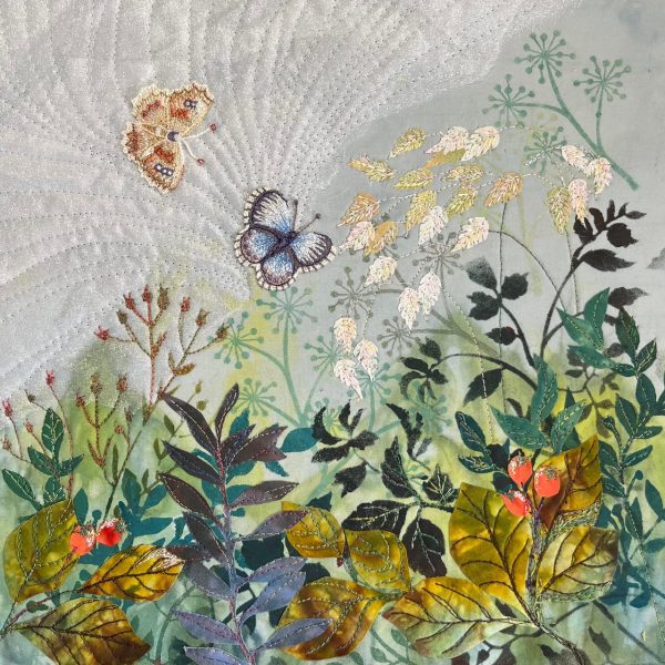 The background is hand dyed and then stencilled with foliage shapes. Collaged on top are berries, more foliage and the two butterflies. Finally the piece is stitched with variegated threads using the free motion technique.