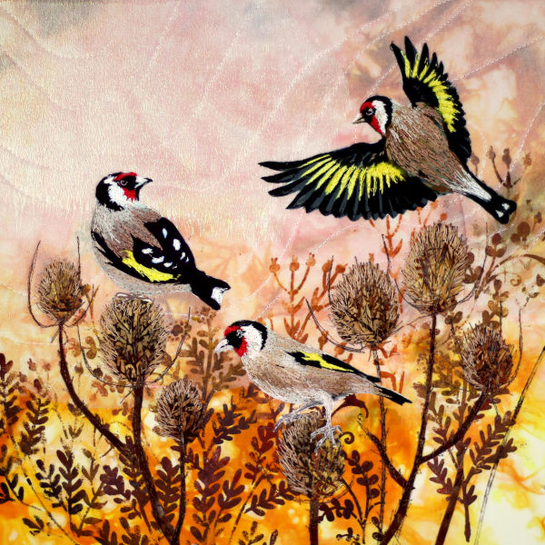 In the foreground three goldfinches alight on teasels. Raw edge fabric collage with machine stitching.